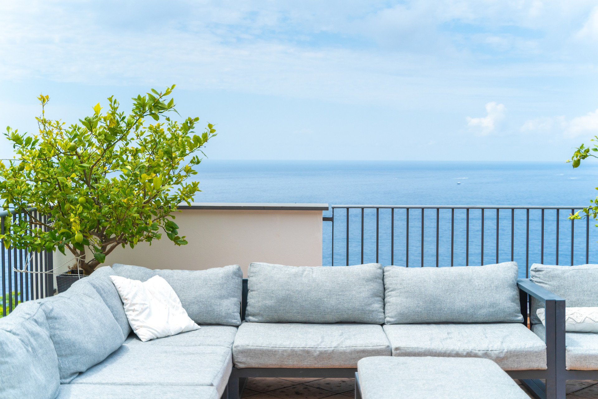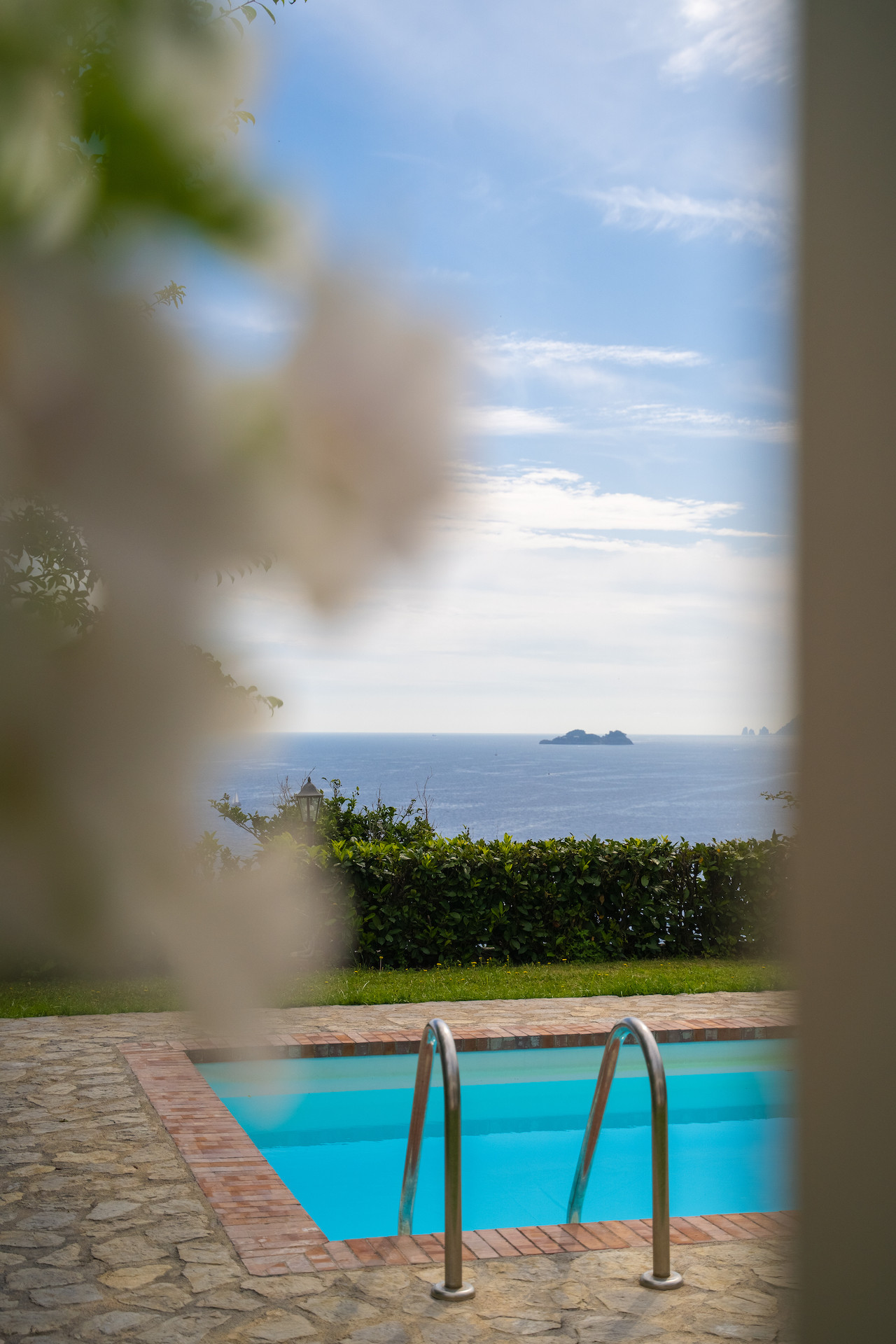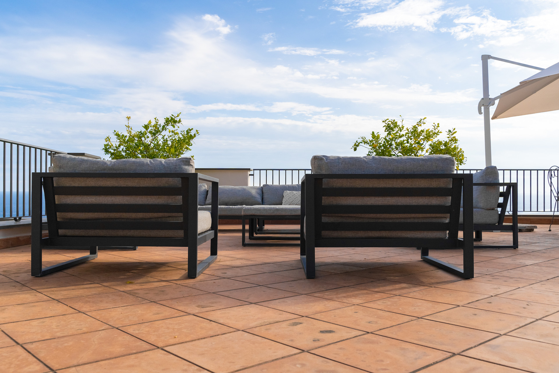 The terrace is 100 square meters (1076 square feet) large. The terrace is equipped with a wicker sofa and two armchairs, a circular wicker sofa with an attached awning, as well as with tables, chairs and two large umbrellas. From the terrace you can enjoy a stunning view of the sea, the islands of Li Galli and Praiano. In addition, you will have at your disposal a seasonal above-ground swimming pool of 4x8. From the pool you can enjoy a fascinating view of the sea and the garden.