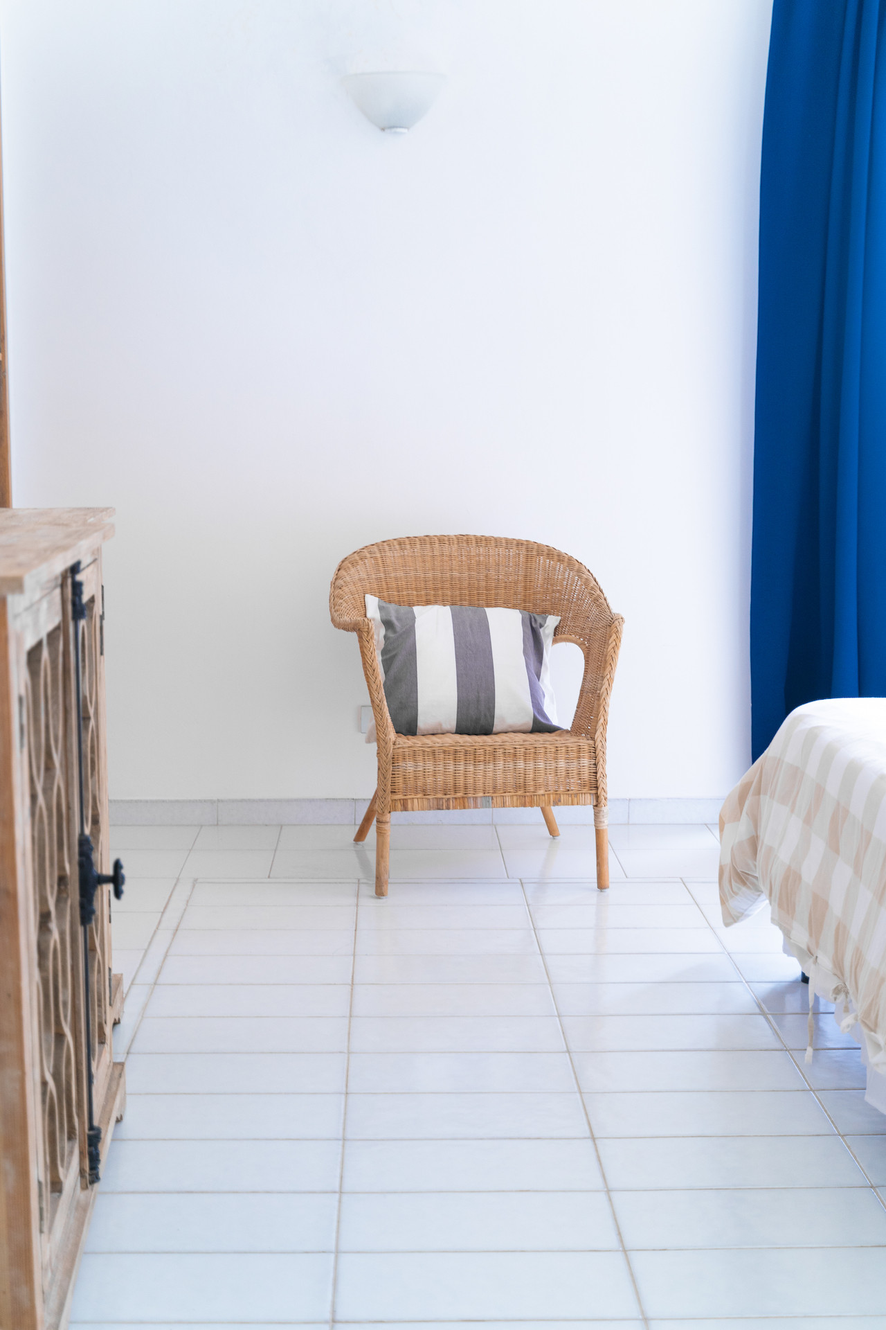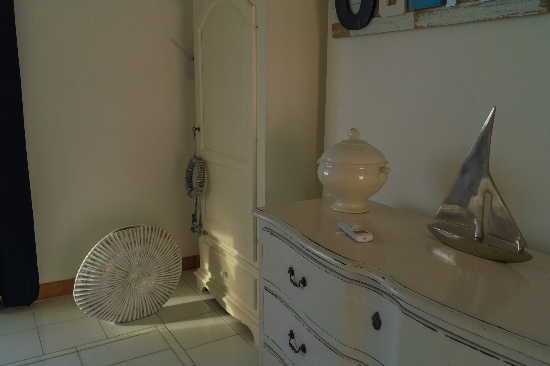 4) The bedroom has a double bed (160 cm/62 inches, wider than a queen-size bed). From the bedroom you are able to enter a garden with a sea view through a French window. The room is equipped with an air conditioning and heating unit.