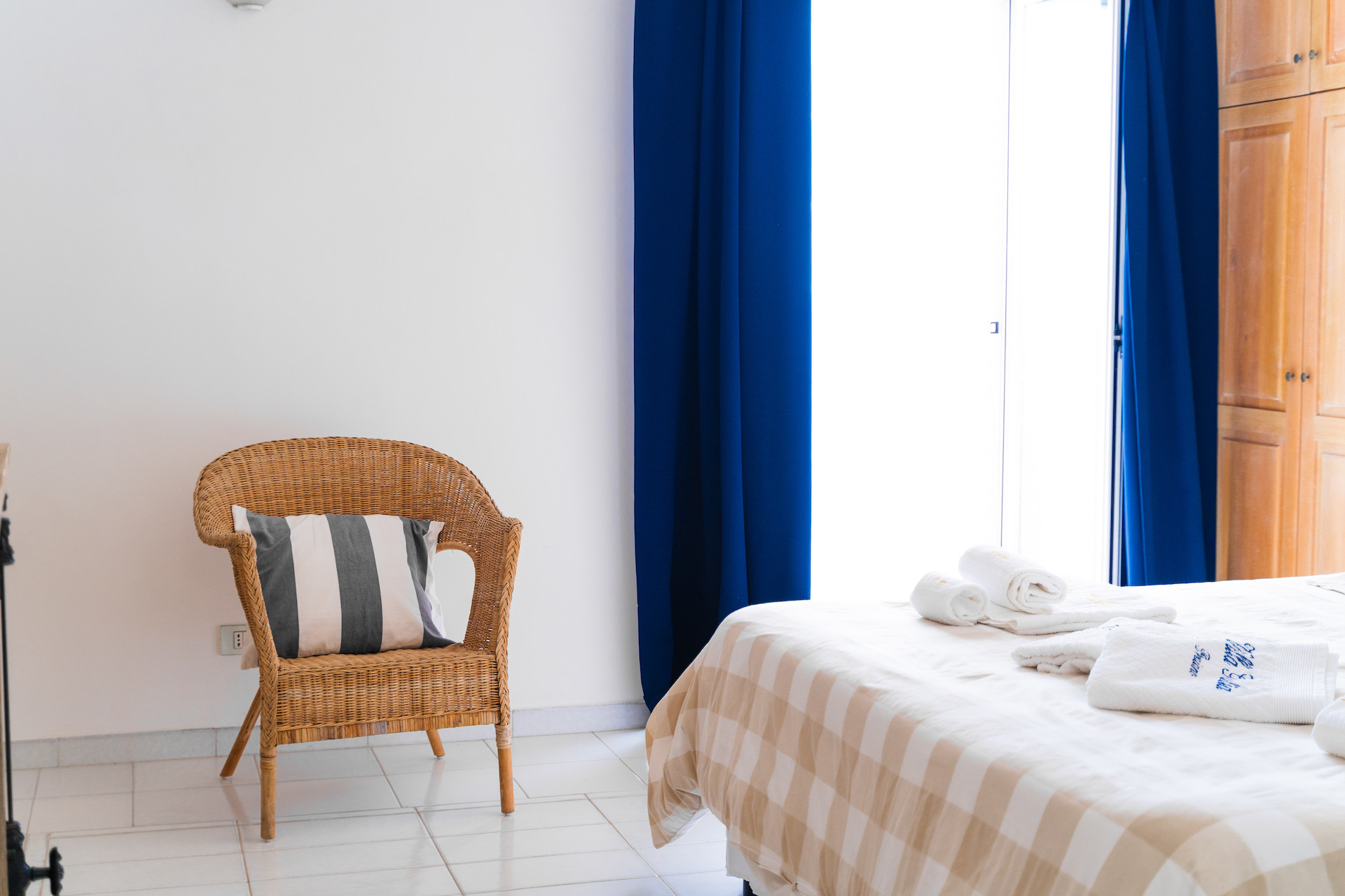 2) The bedroom has a double bed (160 cm/62 inches, wider than a queen-size bed). In this room you will find a satellite television. From the bedroom you are able to enter a long terrace with a sea view through a French window. The room is equipped with an air conditioning and heating unit. This room has a bathroom, tiled with shiny yellow majolica tiles and equipped with a sink, a toilet, a fully enclosed shower and a hairdryer.
