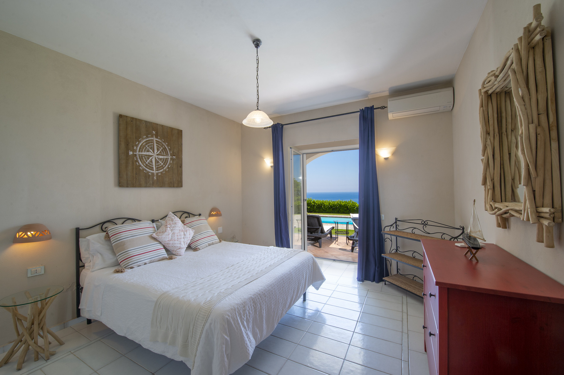 5) the fifth bedroom you will reach always through the same corridor the bedroom has a double bed (160 cm/62 inches, wider than a queen-size bed). From the bedroom you are able to enter a garden with a sea view through a French window. The bedroom also has a window with a view of the garden. The room is equipped with an air conditioning and heating unit.
