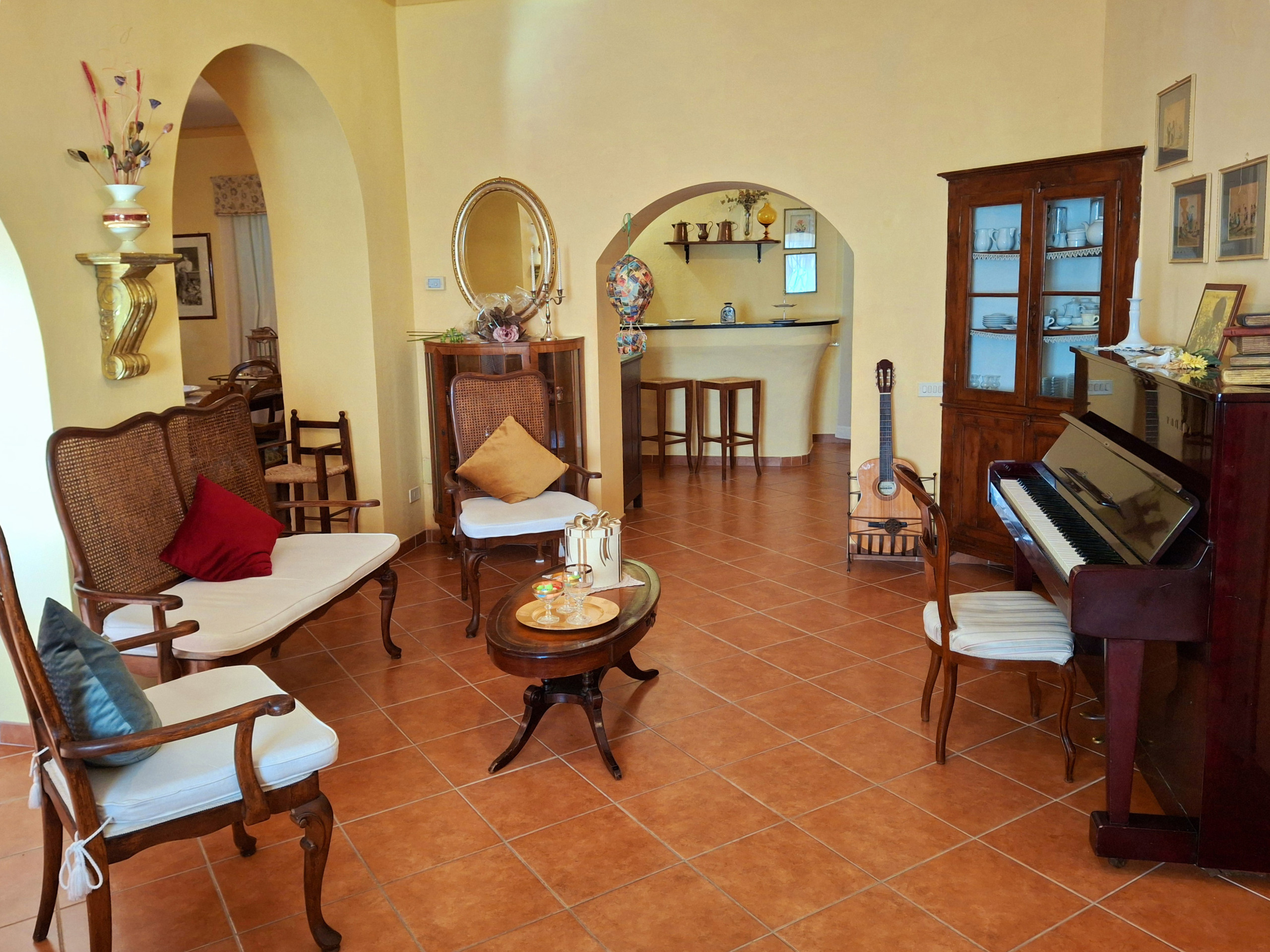 On the ground floor there are three large rooms, two of which with stone fireplaces and one with a piano. The lounges allow direct access to the semicircular terracotta solarium. Also on the ground floor there are two double bedroom with private bathroom with shower.