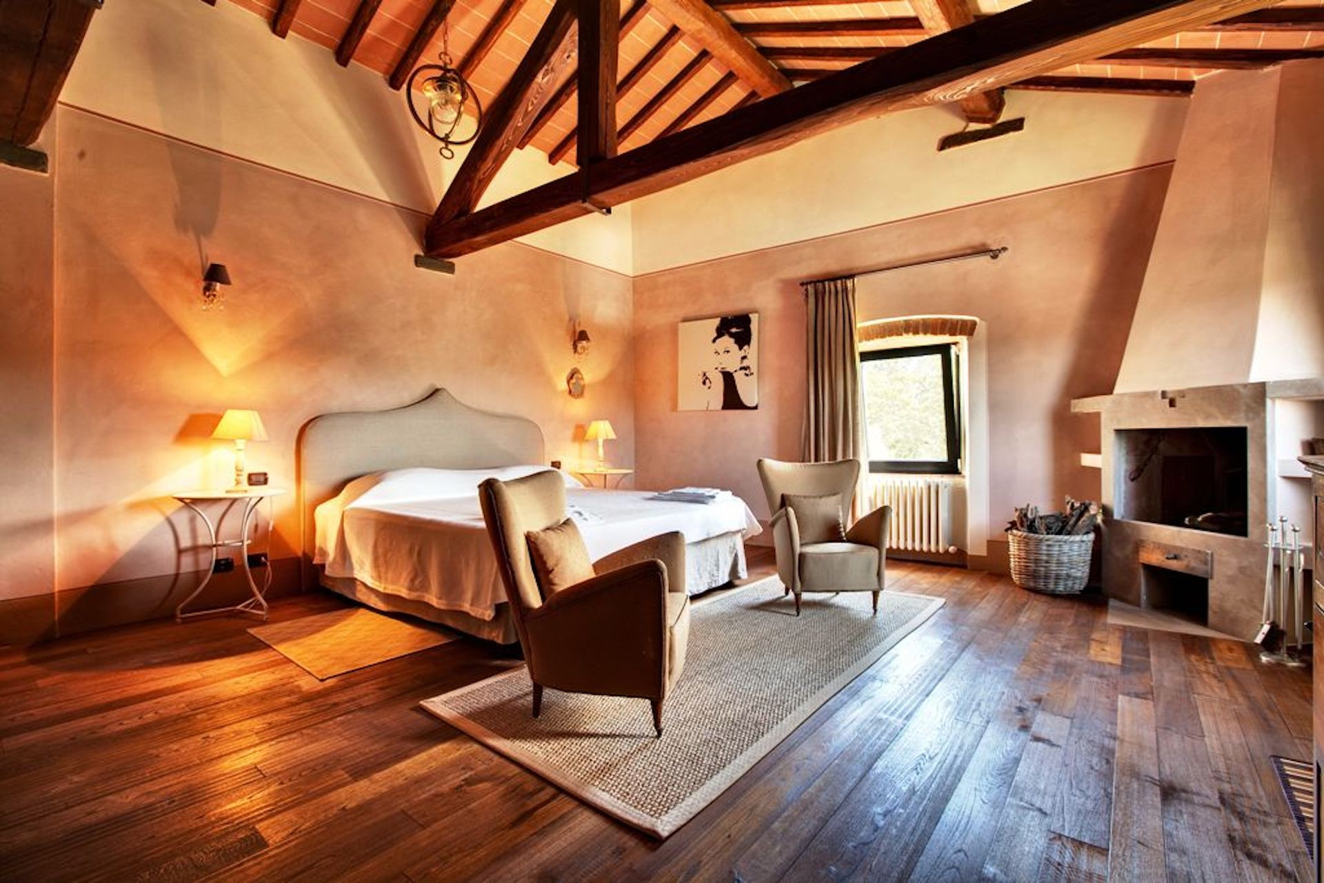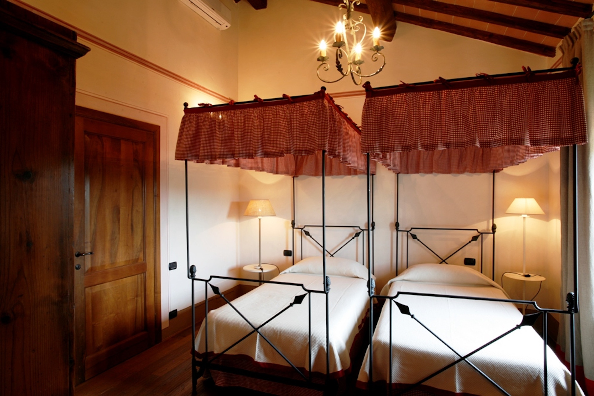 The ground floor of the villa itself is full of light and very airy; it has a large dining room which opens onto the garden and also a fireplace for Winter evenings. It has to kitchens, various lounge rooms for relaxing, reading, watching TV , playing cards or simply enjoying a good glass of Chianti wine in comfort and privacy. On the same floor there is a comfortable double bedroom with private bathroom.