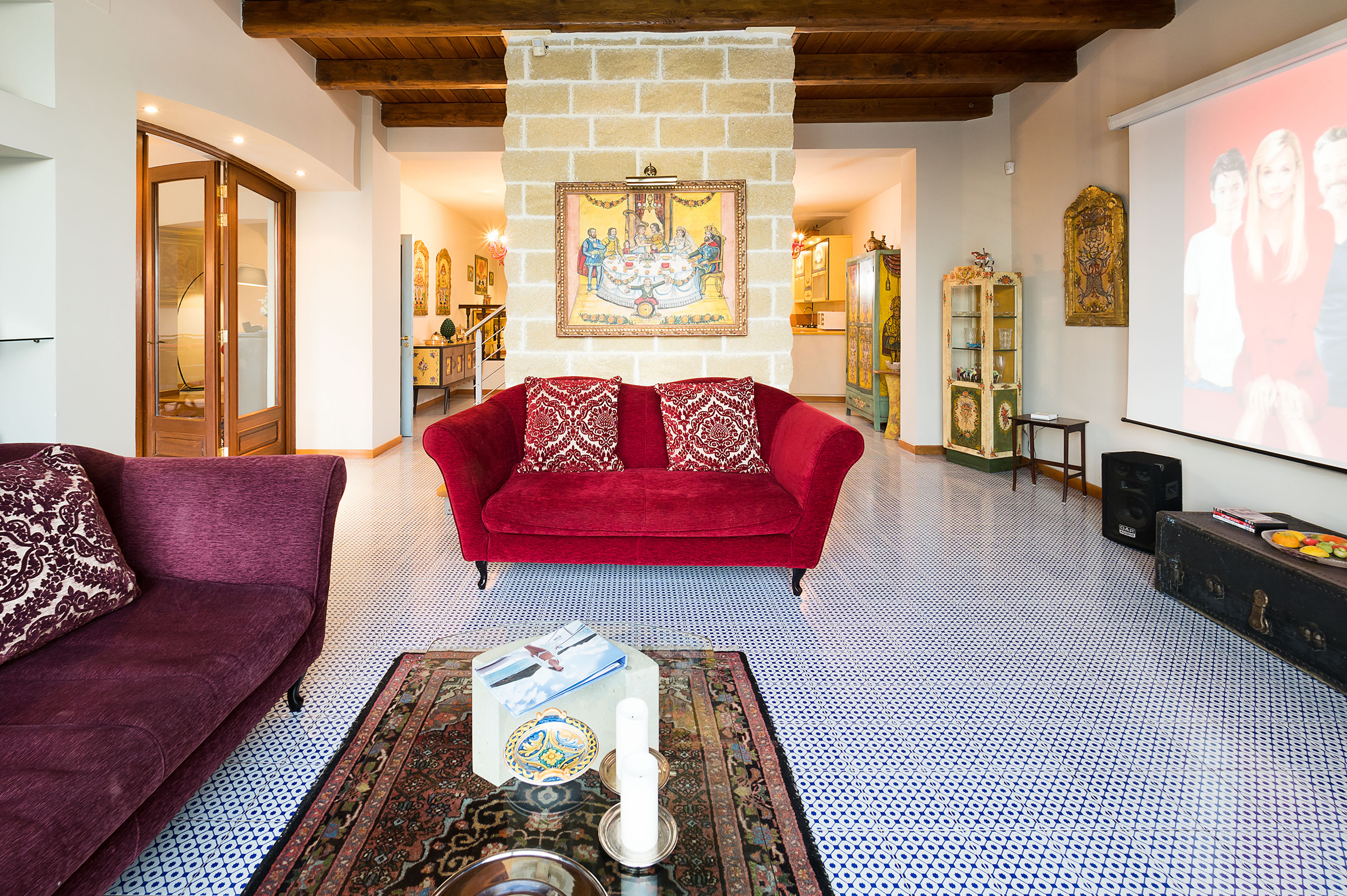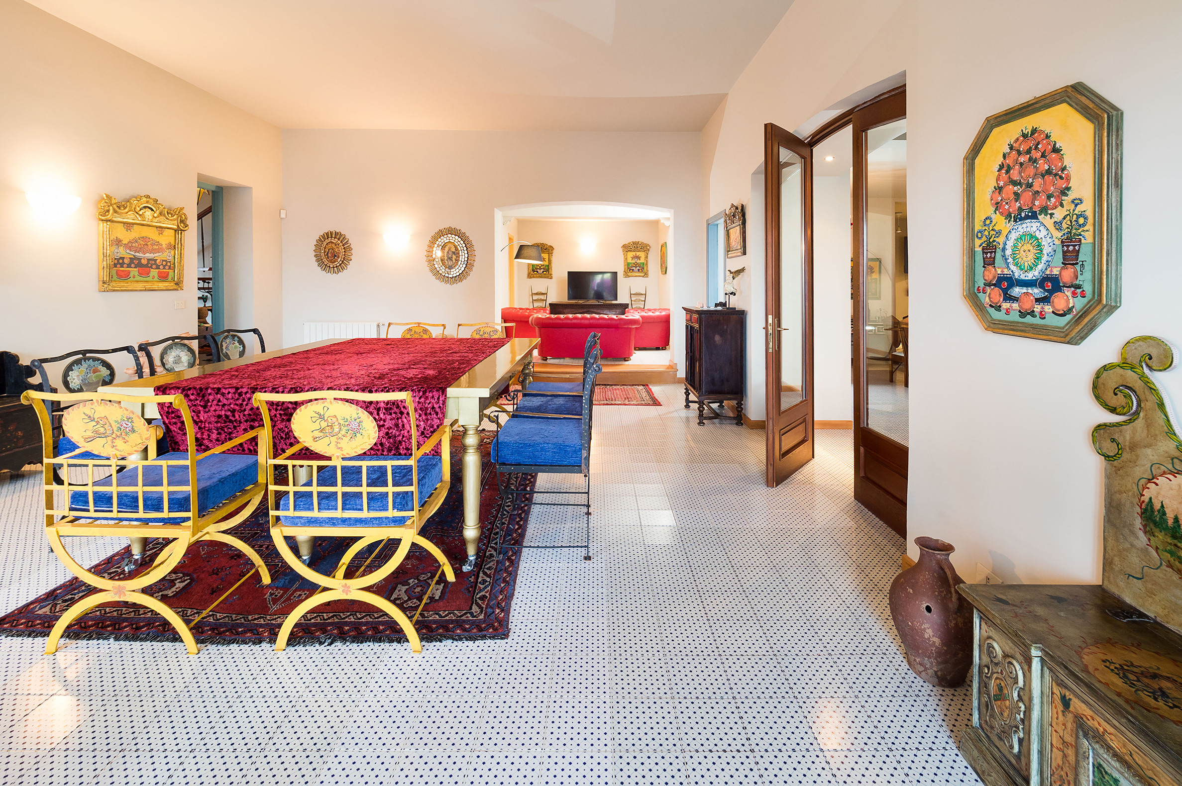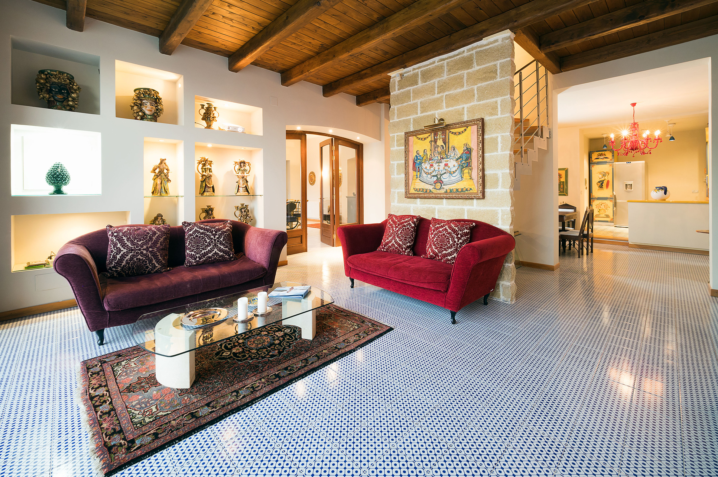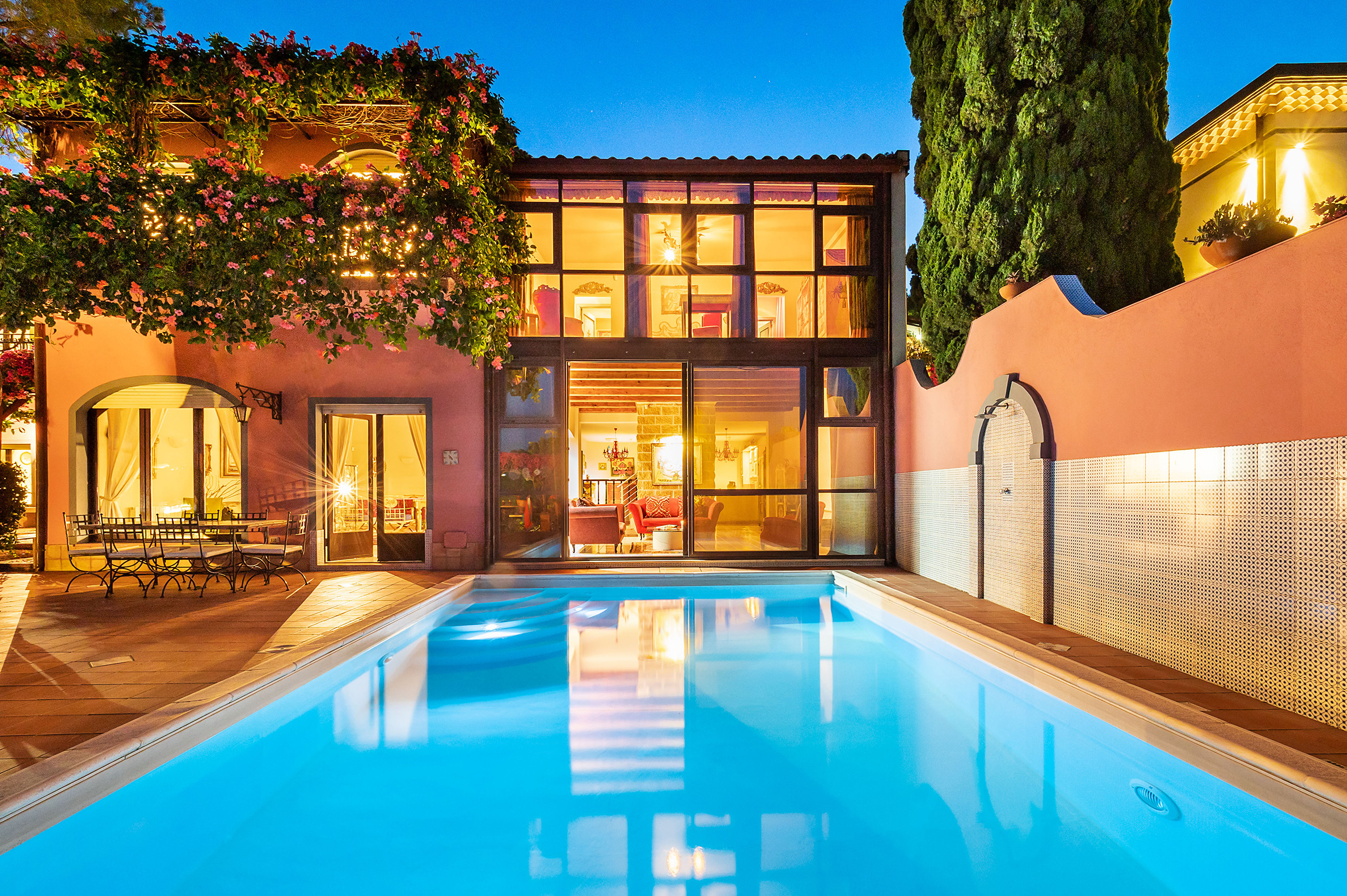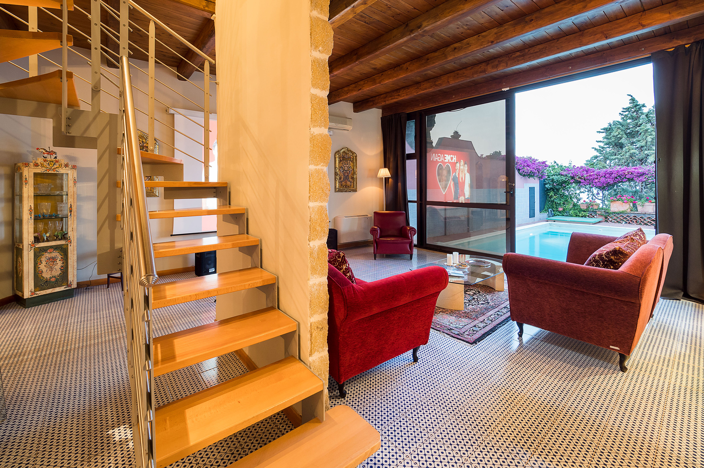 ideal for outdoor living. Elegantly furnished with great attention to detail, this villa features a beautiful Sicilian style with ancient ceramics and antique furniture pieces. Spread over two levels, the villa comfortable interiors include on the ground floor a bedroom with an en-suite bathroom and a large living area with sitting room with TV, lounge with big screen and projector, study, dining room, kitchen and guest bathroom. From the living room two staircases lead to the first floor where there are four romantic bedrooms and four bathrooms. All rooms