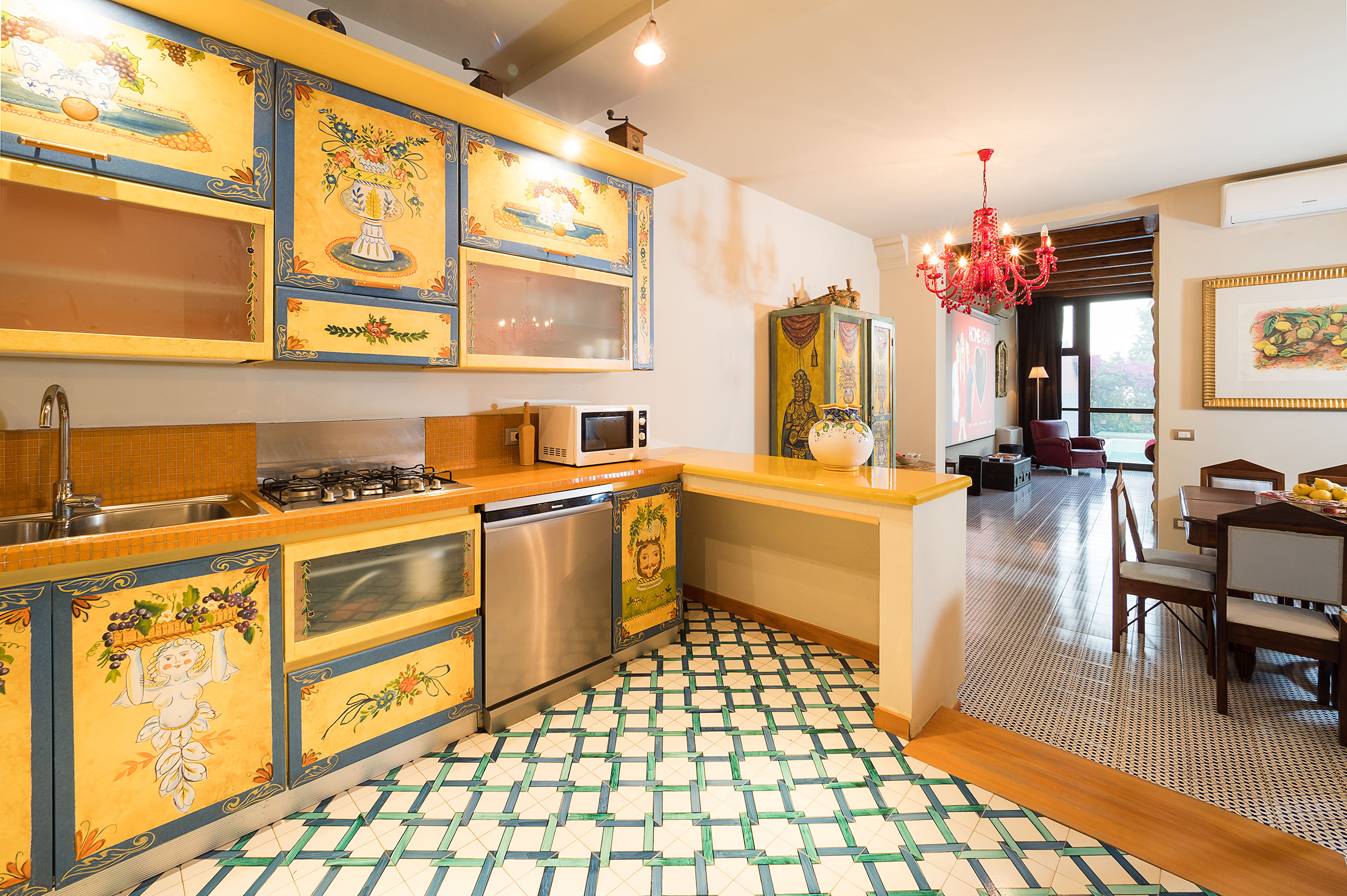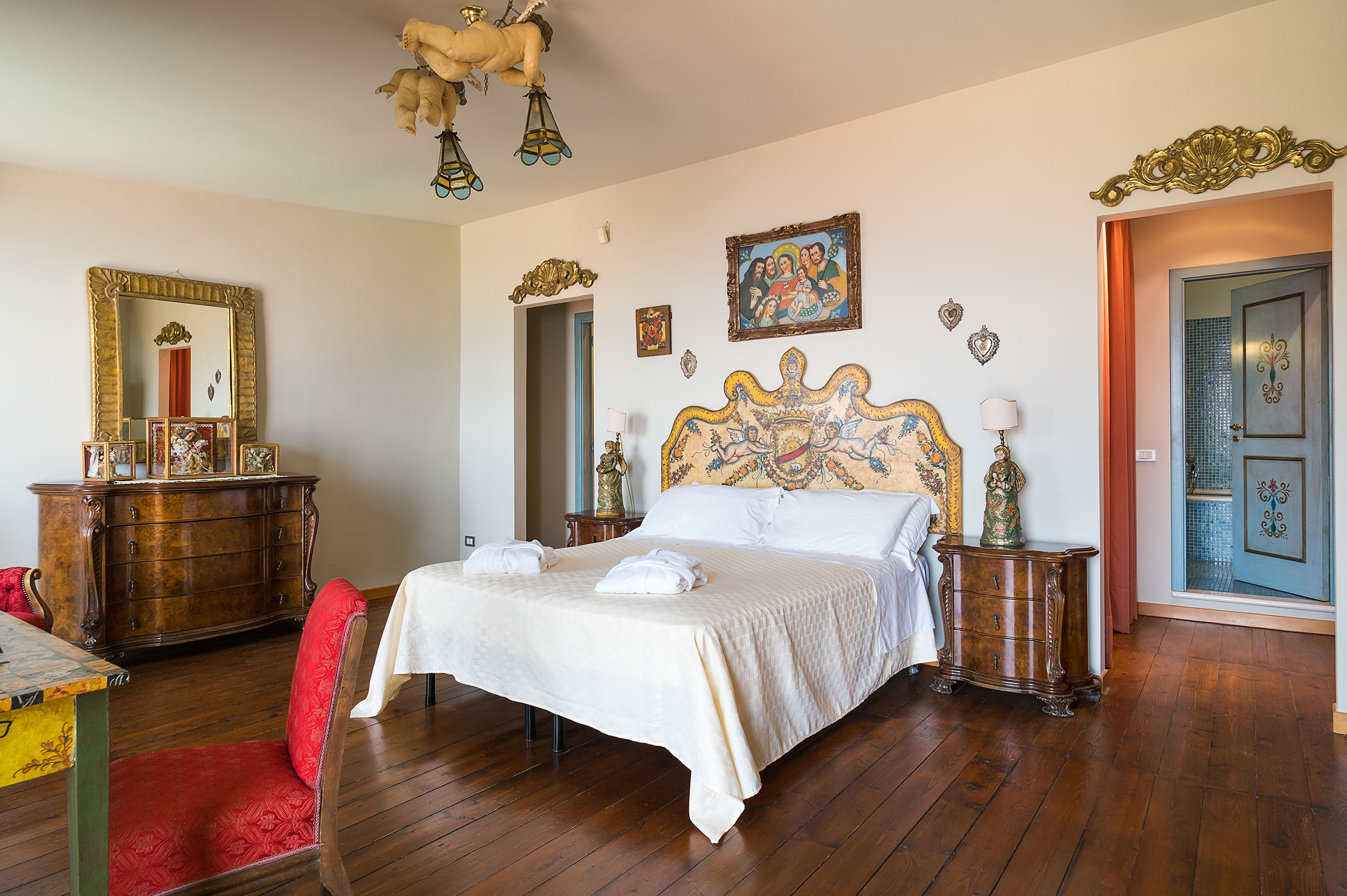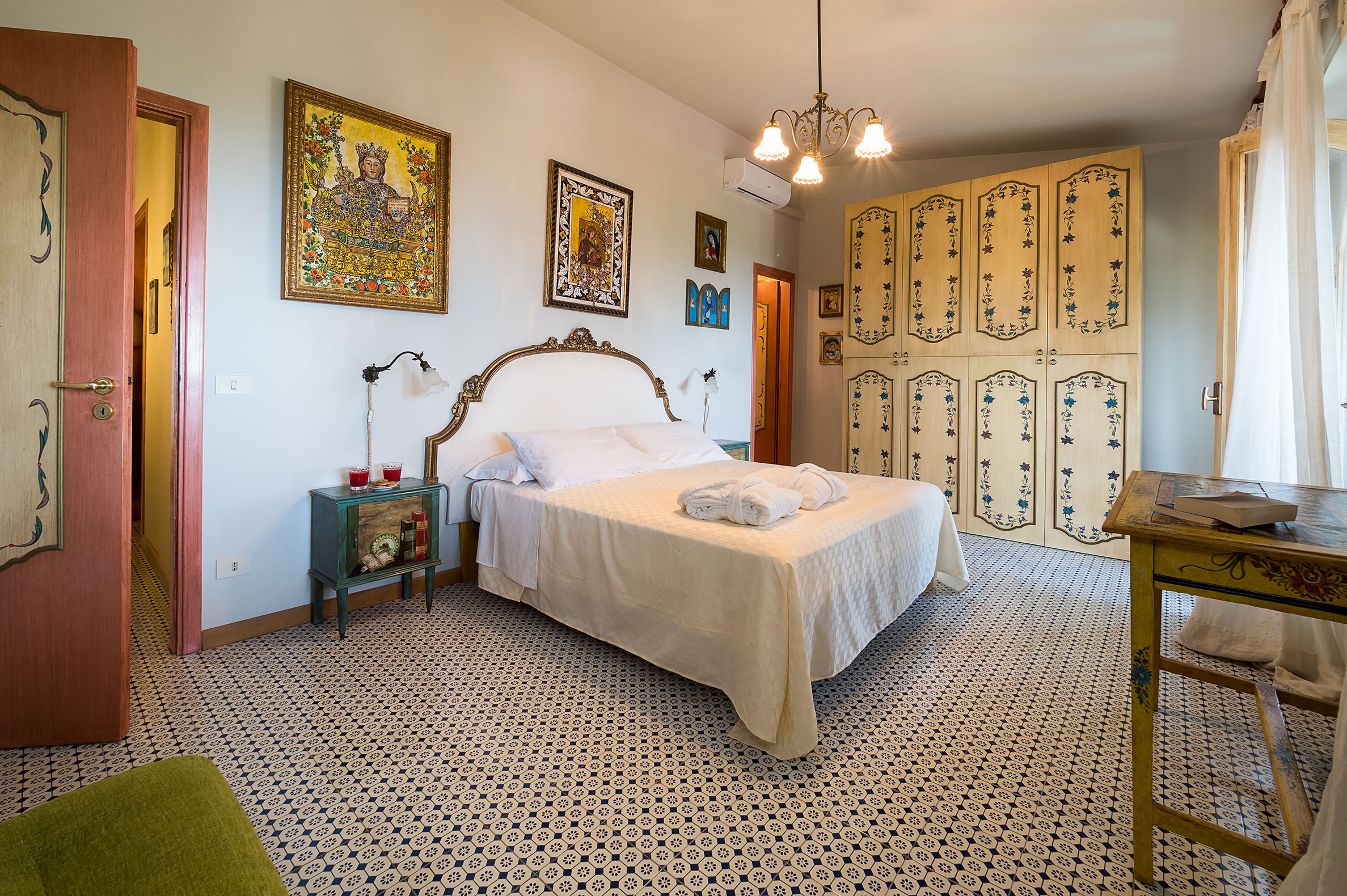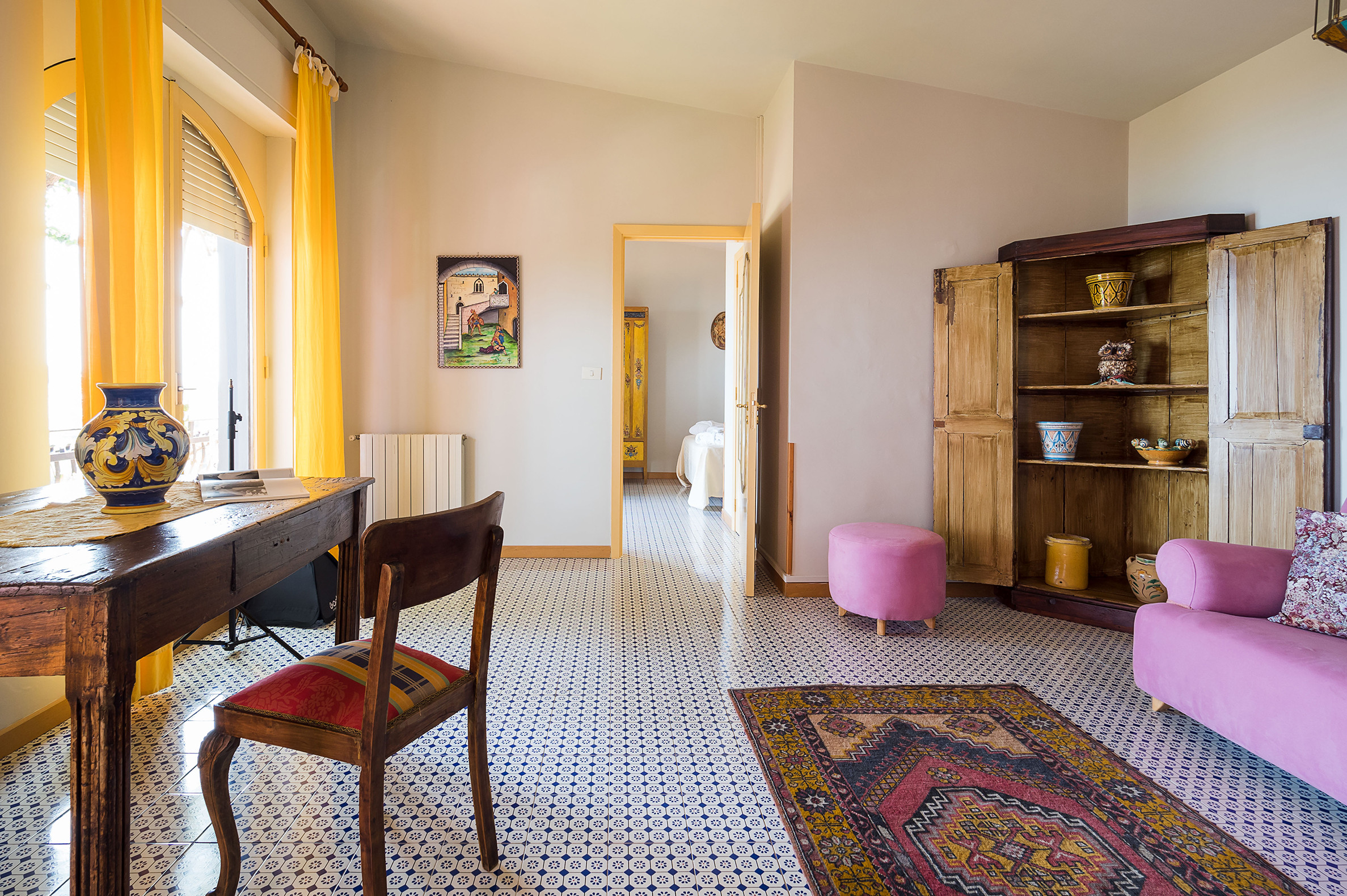 ideal for outdoor living. Elegantly furnished with great attention to detail, this villa features a beautiful Sicilian style with ancient ceramics and antique furniture pieces. Spread over two levels, the villa comfortable interiors include on the ground floor a bedroom with an en-suite bathroom and a large living area with sitting room with TV, lounge with big screen and projector, study, dining room, kitchen and guest bathroom. From the living room two staircases lead to the first floor where there are four romantic bedrooms and four bathrooms. All rooms