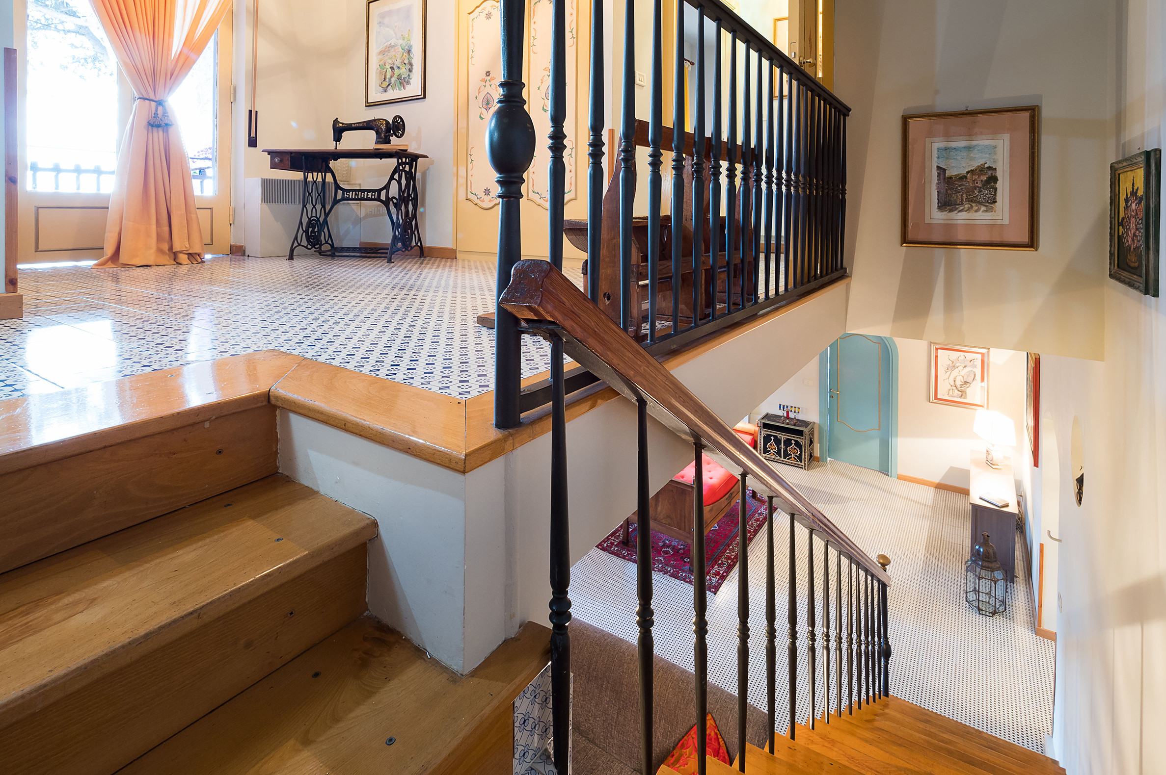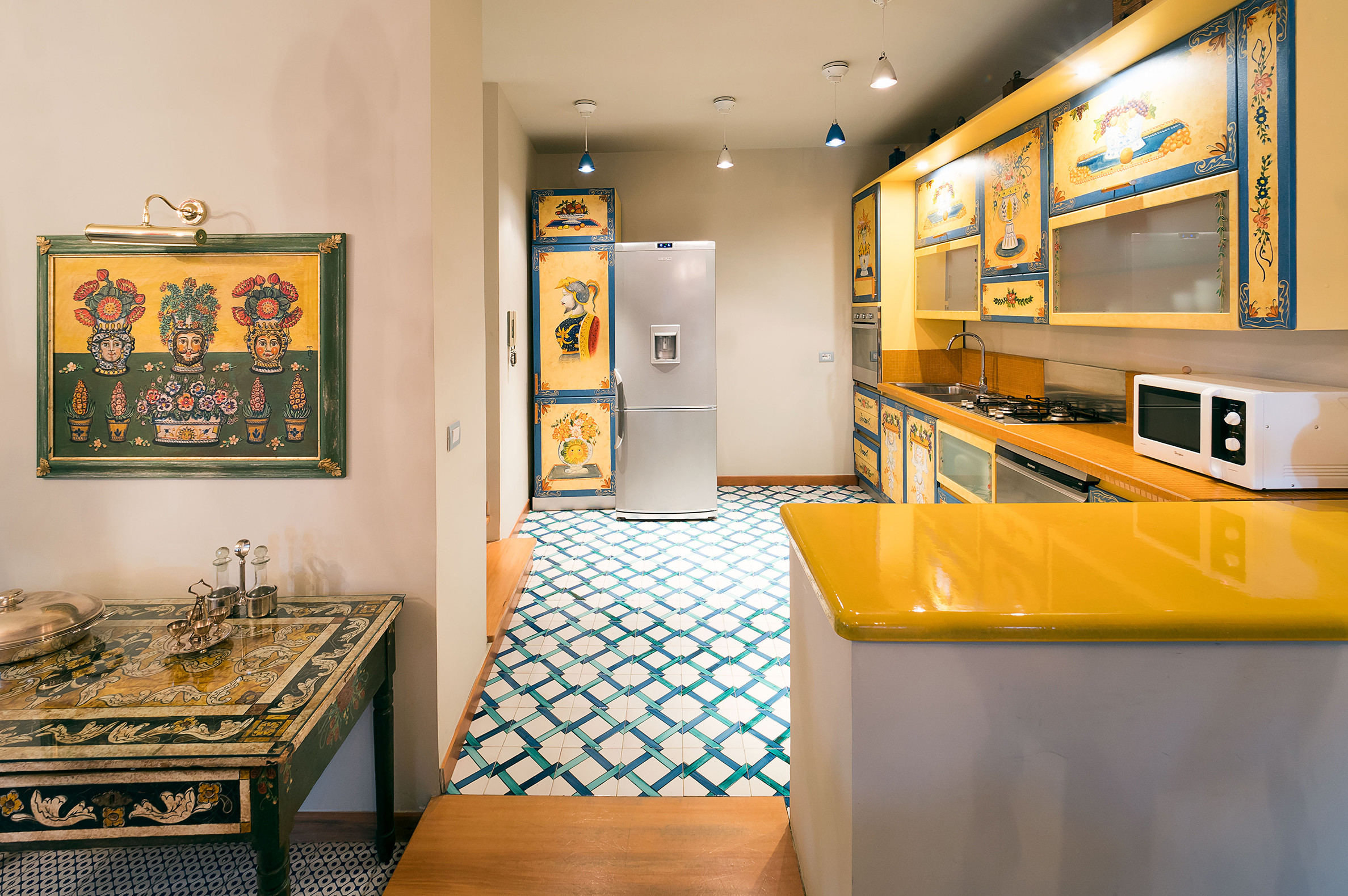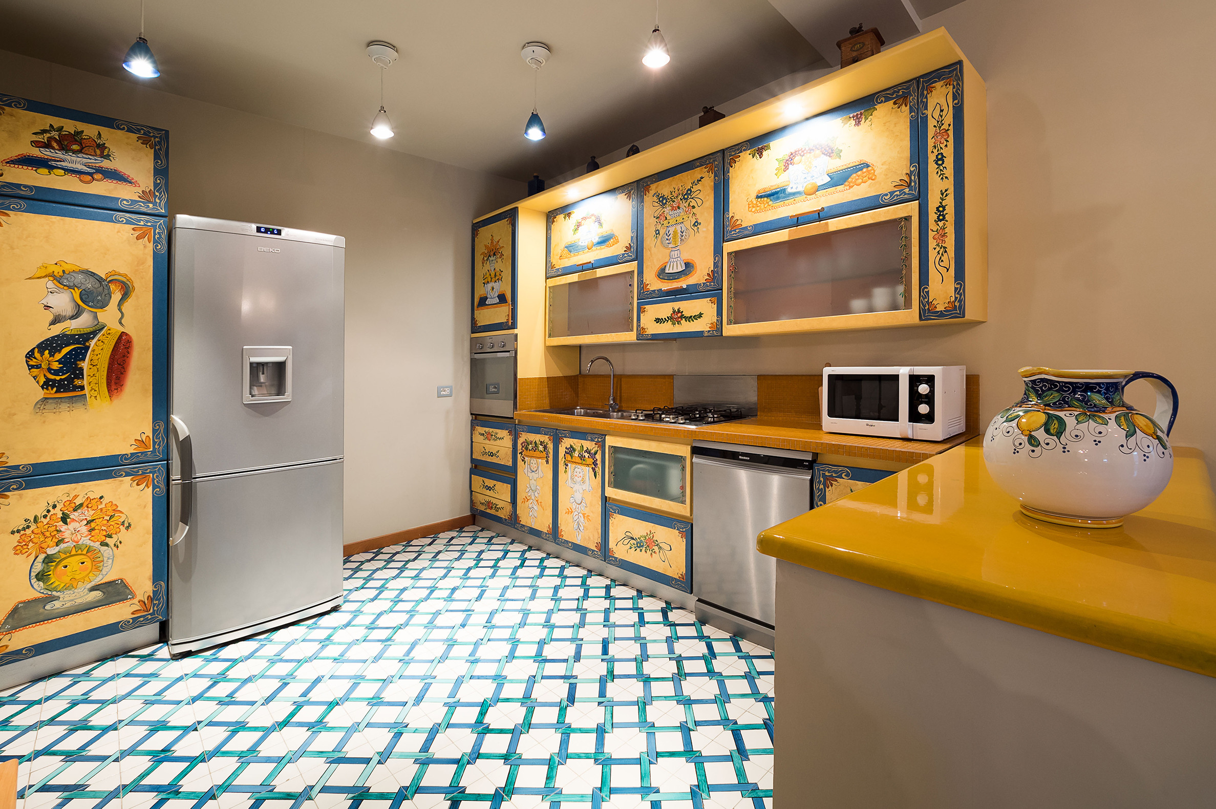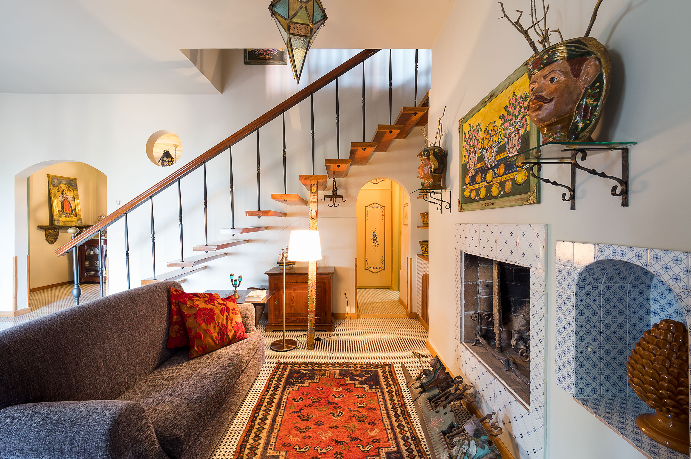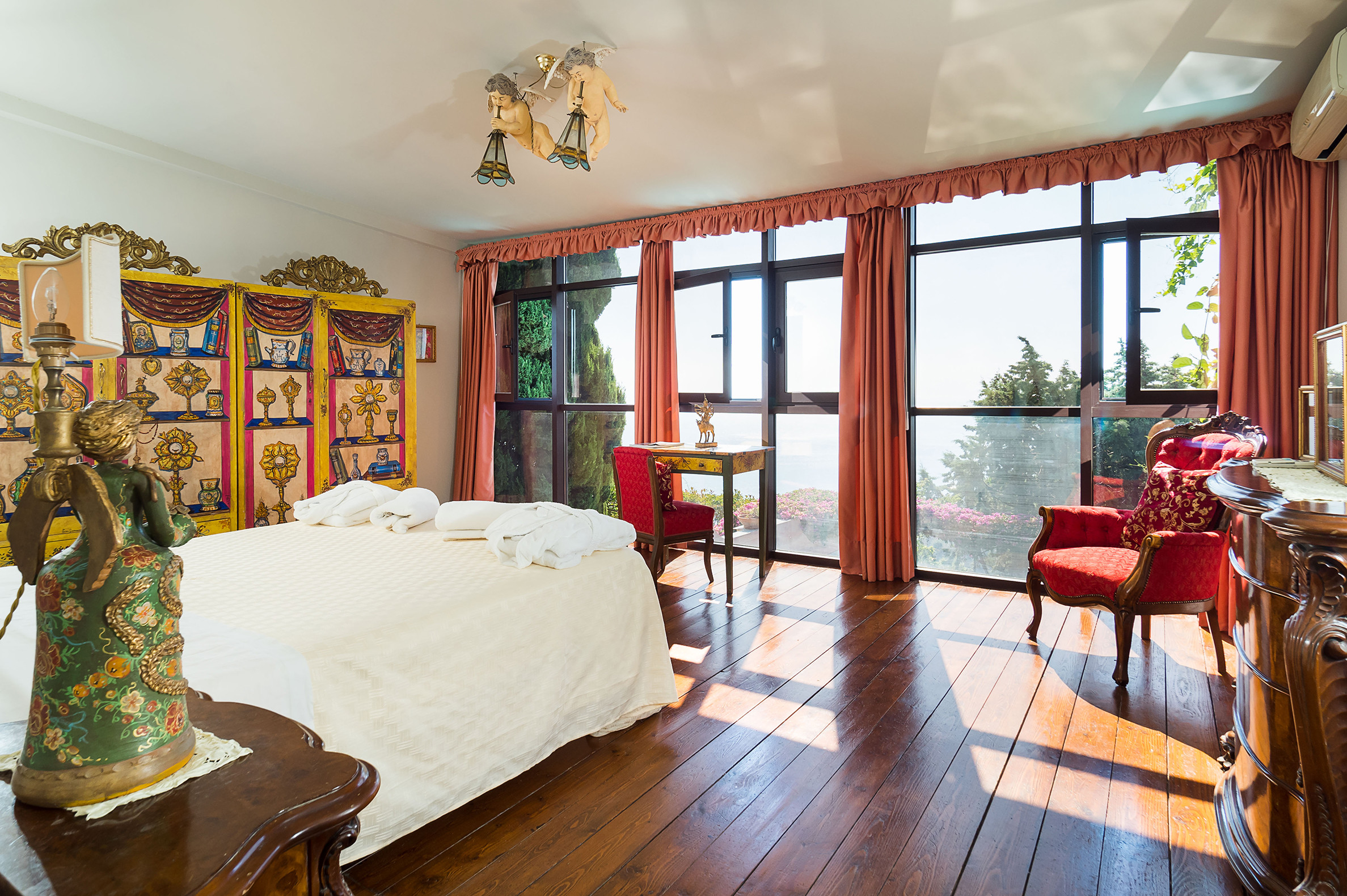 ideal for outdoor living. Elegantly furnished with great attention to detail, this villa features a beautiful Sicilian style with ancient ceramics and antique furniture pieces. Spread over two levels, the villa comfortable interiors include on the ground floor a bedroom with an en-suite bathroom and a large living area with sitting room with TV, lounge with big screen and projector, study, dining room, kitchen and guest bathroom. From the living room two staircases lead to the first floor where there are four romantic bedrooms and four bathrooms. All rooms