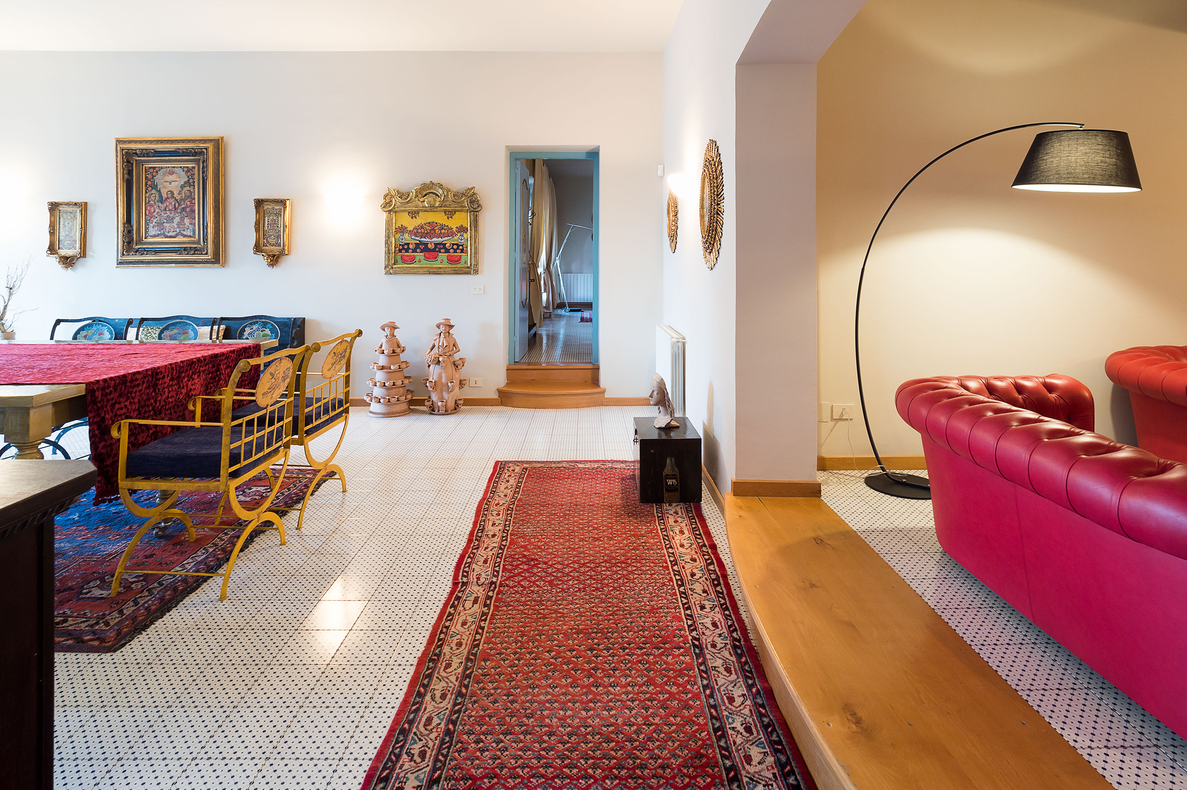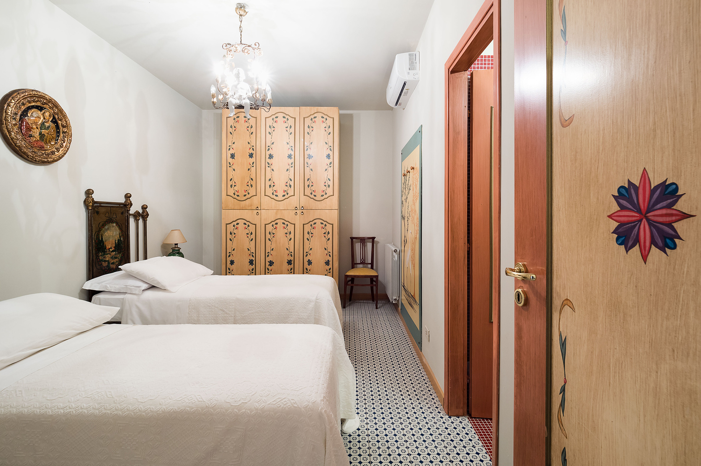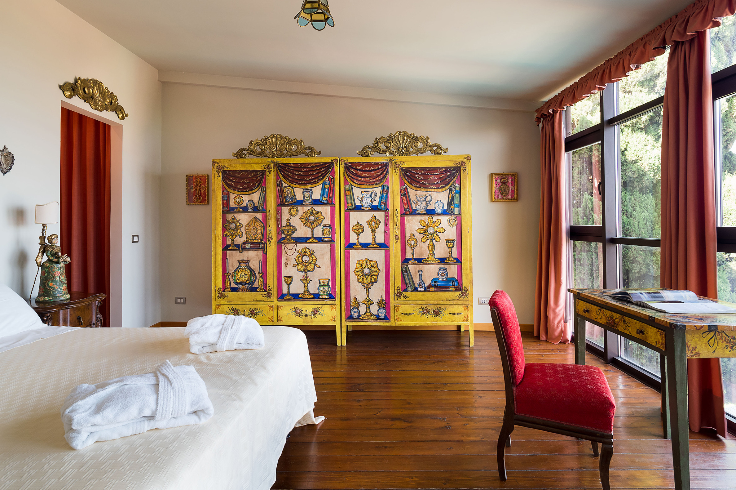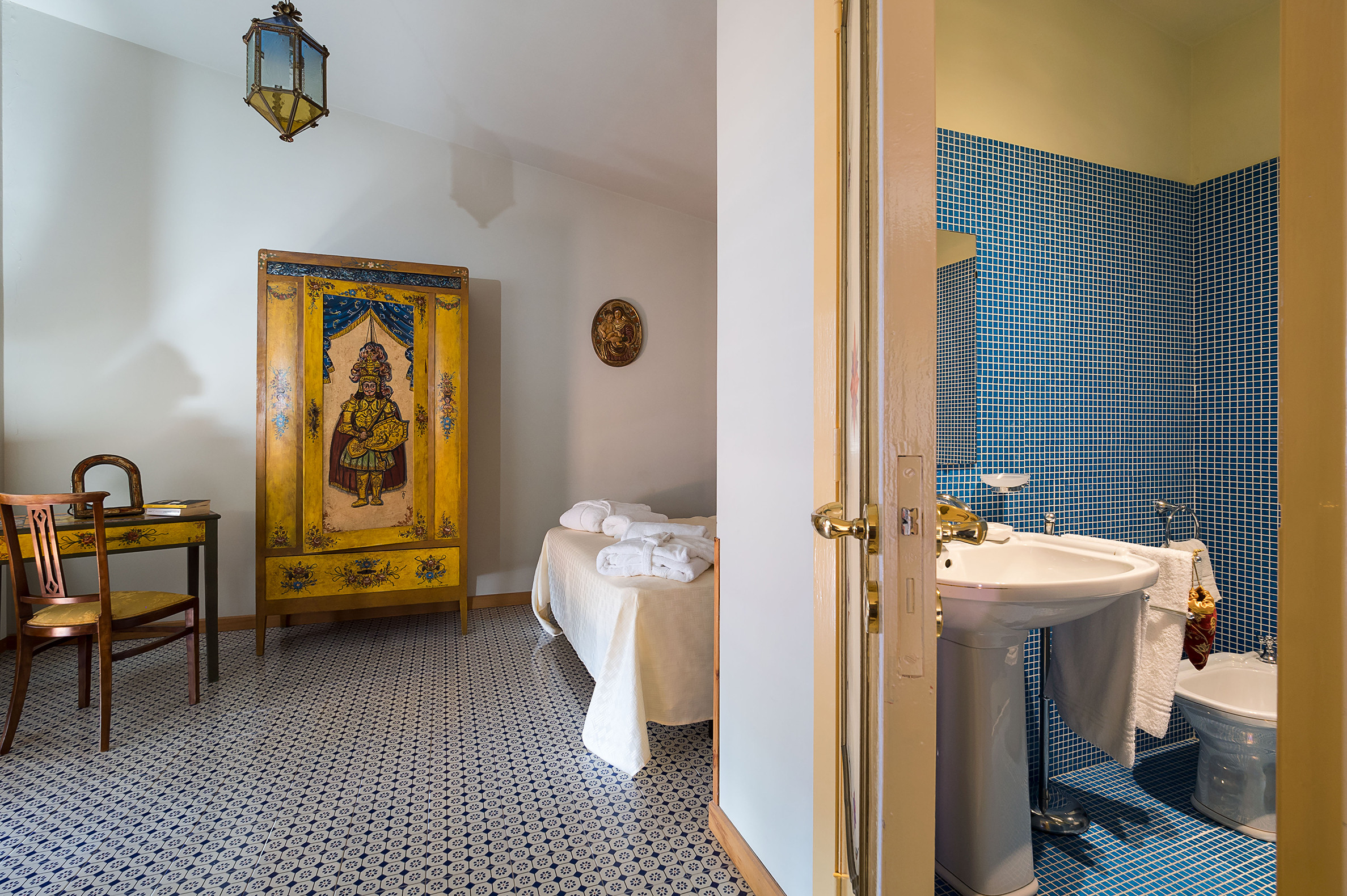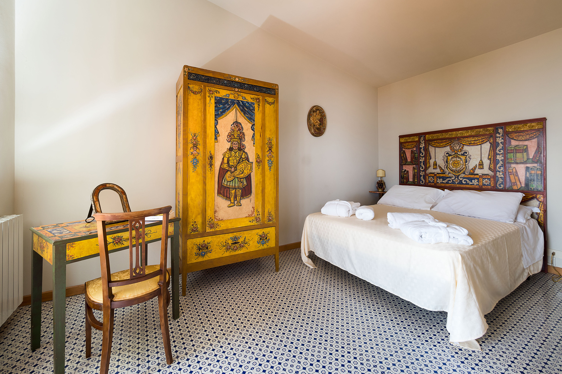 ideal for outdoor living. Elegantly furnished with great attention to detail, this villa features a beautiful Sicilian style with ancient ceramics and antique furniture pieces. Spread over two levels, the villa comfortable interiors include on the ground floor a bedroom with an en-suite bathroom and a large living area with sitting room with TV, lounge with big screen and projector, study, dining room, kitchen and guest bathroom. From the living room two staircases lead to the first floor where there are four romantic bedrooms and four bathrooms. All rooms