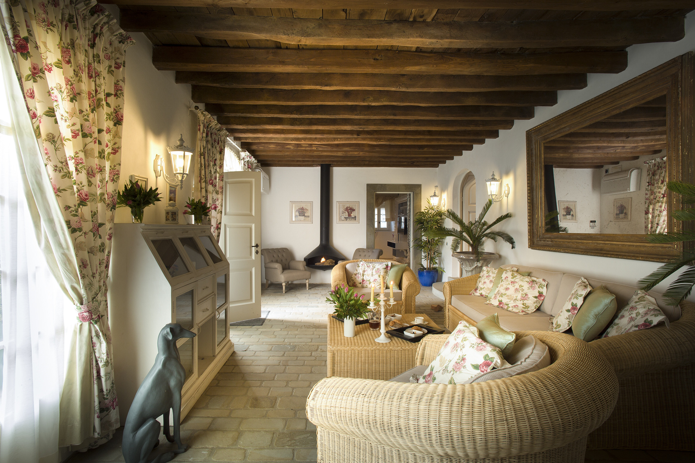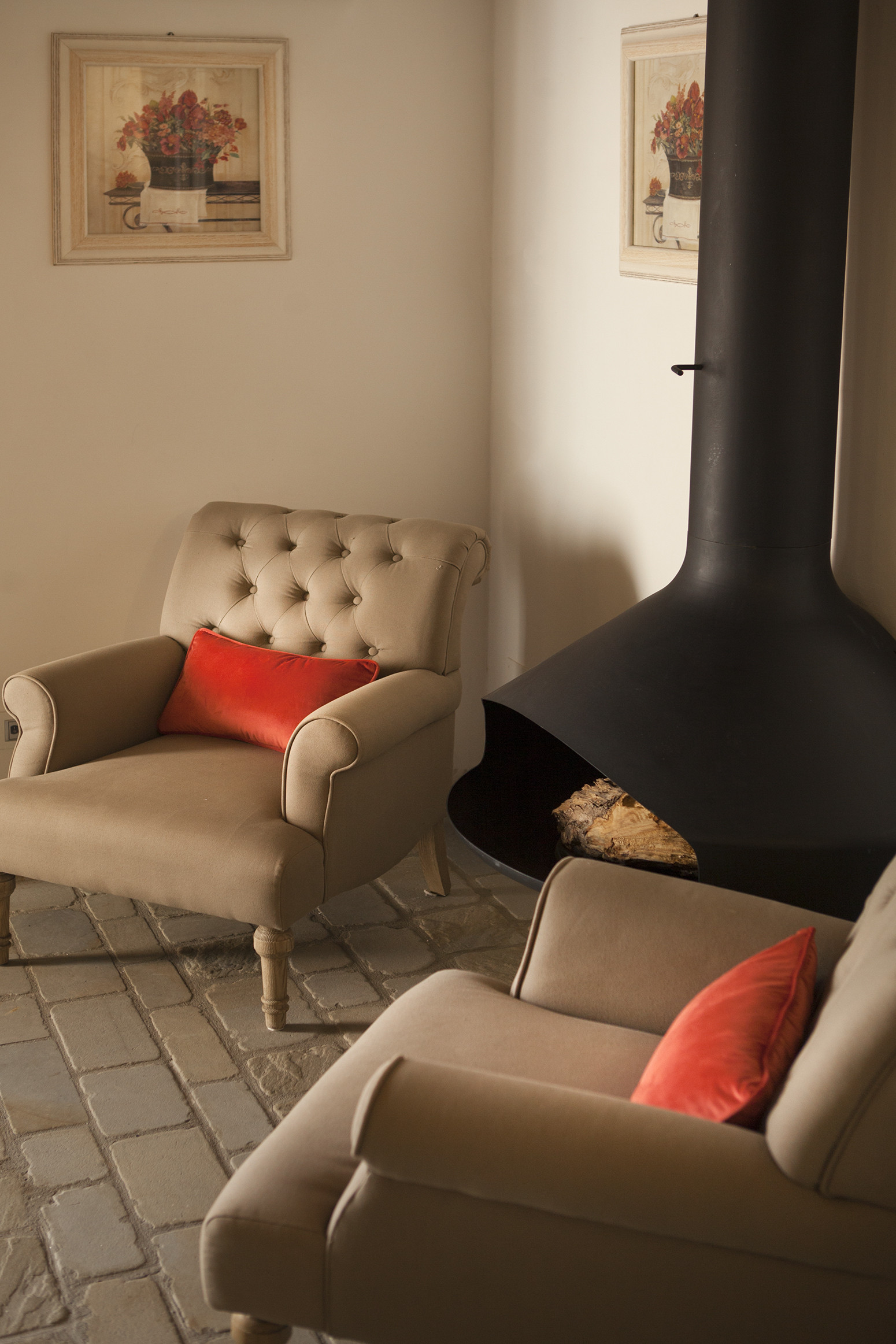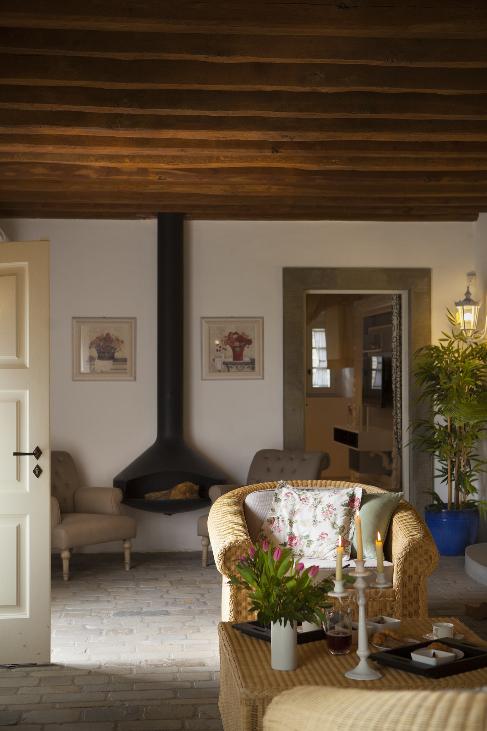 The villa opens onto a large and bright verandah with fireplace, antique stone floors and a comfortable divan where you can