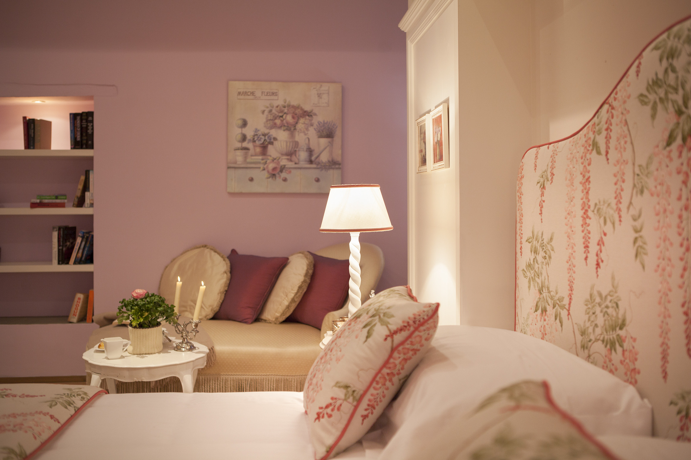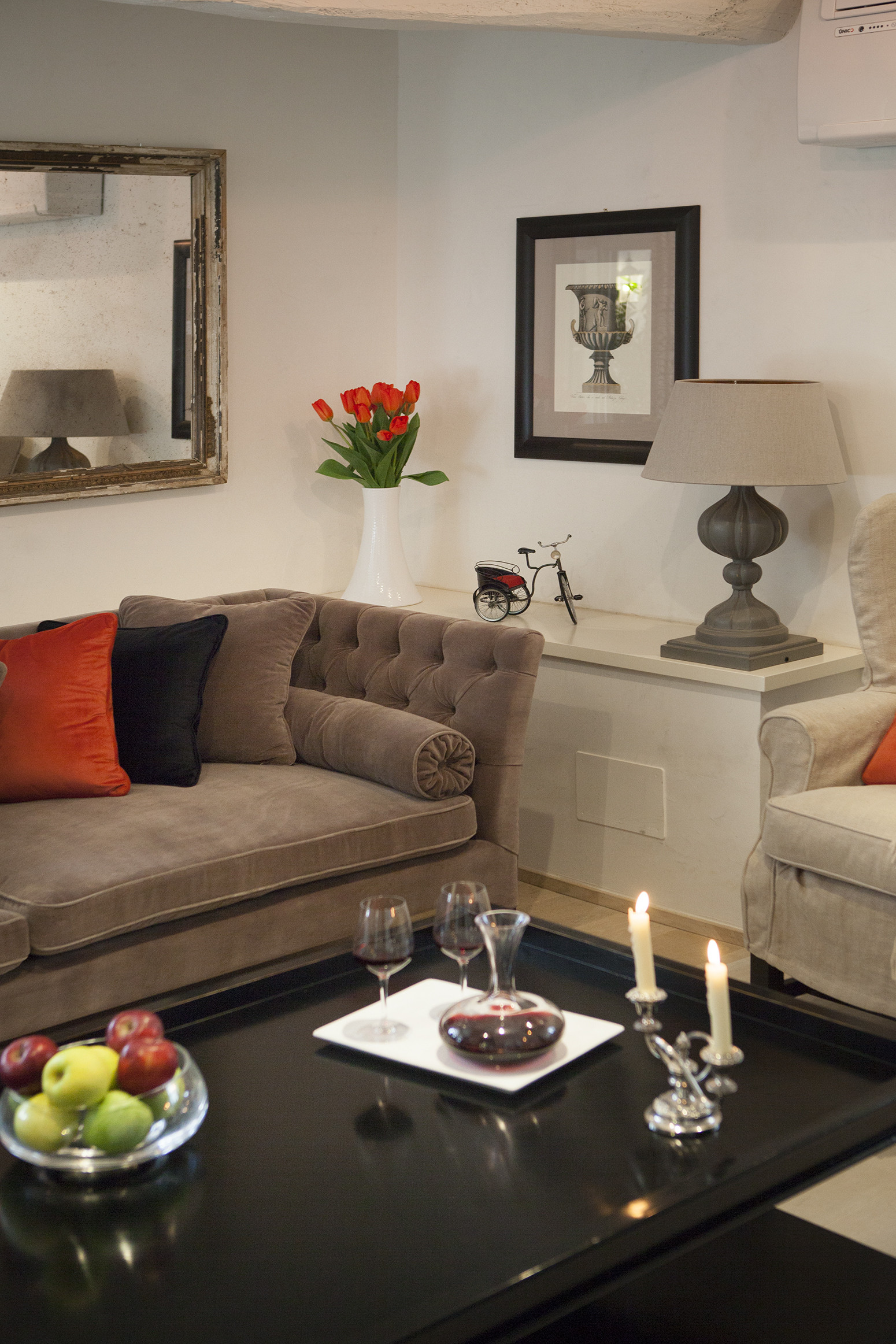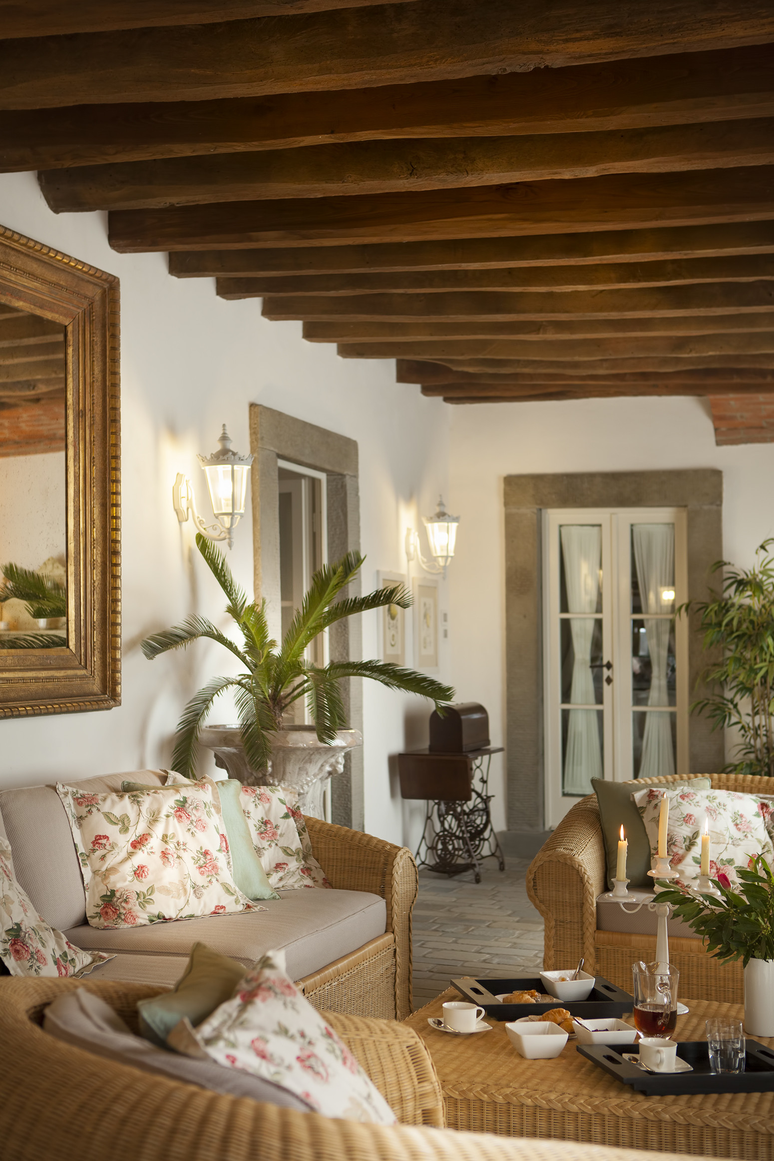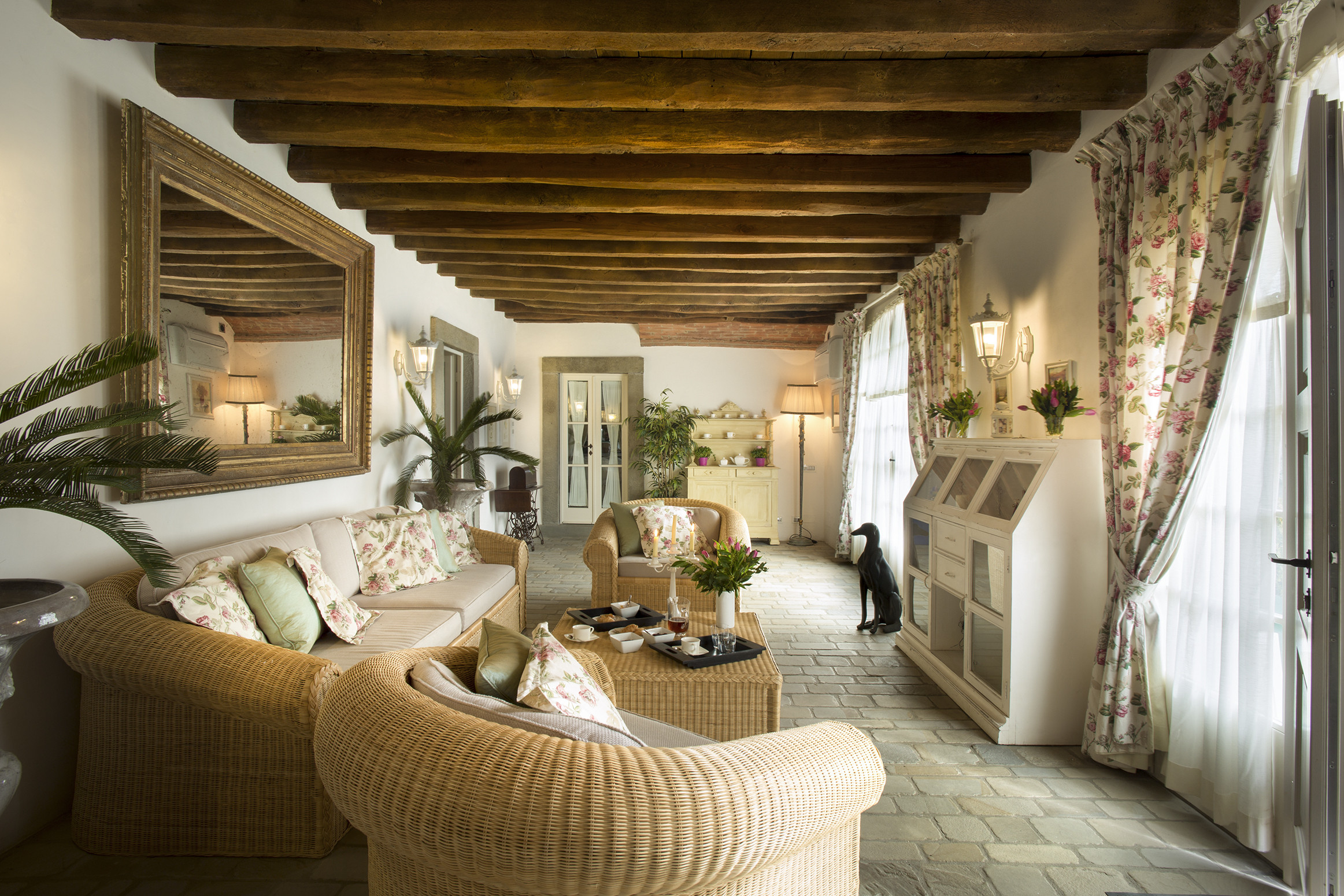 The villa opens onto a large and bright verandah with fireplace, antique stone floors and a comfortable divan where you can