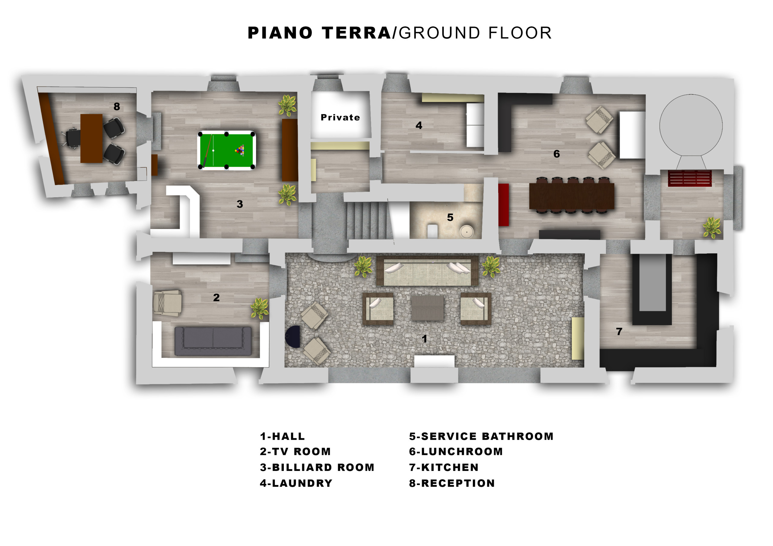 enjoy a glass of the local Chianti wine. From the verandah you enter the billiard room with its bar and on to the kitchen and